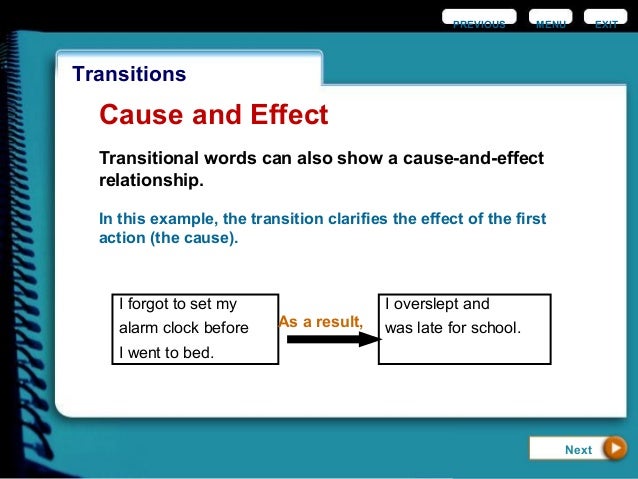 Start studying cause and effect transitions. The linking words that are used to show cause and effect, and their uses in sentences. This handout on transitions will introduce you to some useful transitional expressions and help you employ them effectively.