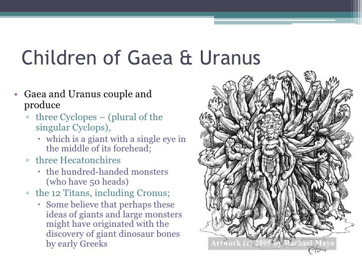 Here we meet with another logical though fanciful conclusion, which a very slight knowledge of the workings of nature proves to have been just and true. He ambushed his father and castrated him. Gaia had numerous other children who appear in a variety of myths. So, gaia and uranus had a whole bunch of babies, as described above.